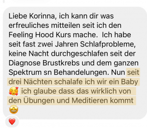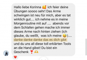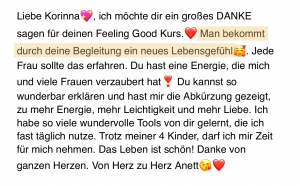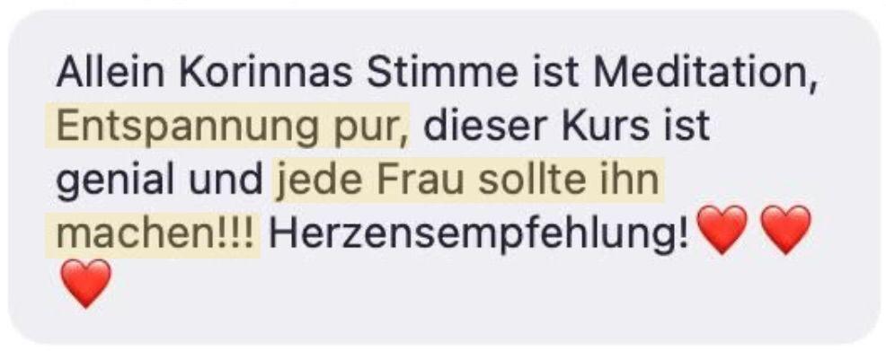 Liebe Korinna, ich möchte dir einfach nur DANKE sagen !!! Es war super schön, wieder einmal einen kleinen Teil meines Weges mit dir zusammen zu gehen!!! Ich liebe deine Energie! Du hast gesagt: „In diesem Kurs steckt so viel Liebe drin“. Das kann ich nur bestätigen. Ich konnte fühlen, wieviel Liebe du in deine täglichen Videos und in die Q and A gesteckt hast. Der Kurs war sooo umfangreich und hat mir so tiefes Wissen über mich und meinen Körper vermittelt. Du hast so viele Fragen von uns allen beantwortet, einfach Wahnsinn, dadurch hatte ich noch zusätzlich so viele Klick-Momente. Dein Video von der Fussmassage ist fantastisch, genau wie all die anderen Zusatzvideos.