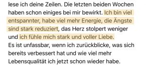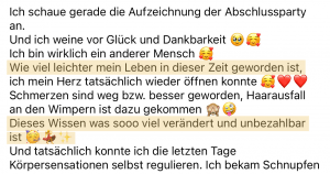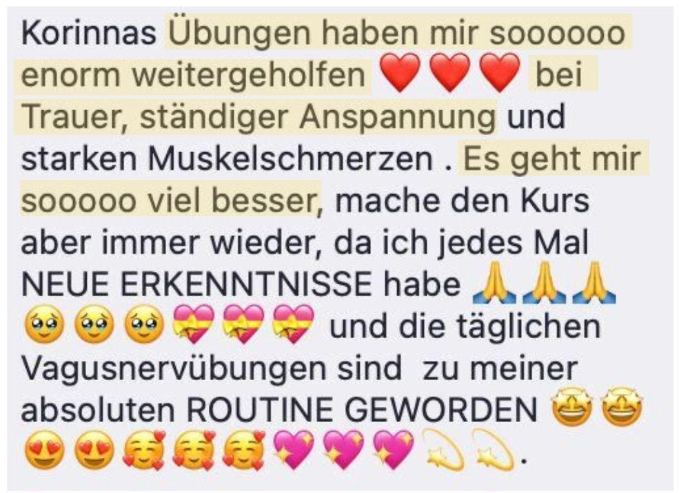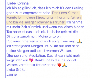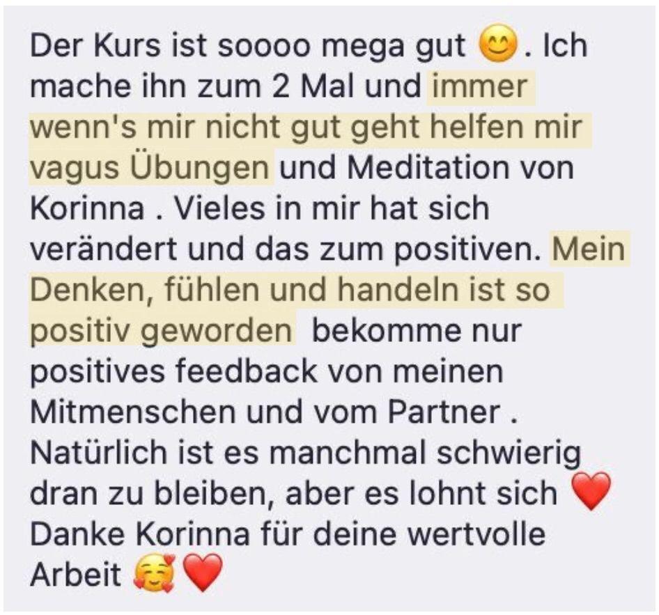 Ich würde sagen mein Leben hat sich so sehr zum Positiven verändert bzw. es ist noch mitten dabei und tut es auch noch weiter durch die vielen Erkenntnisse, die ich gewinnen konnte. Ich bin schon so viel entspannter geworden, was sich auch direkt bei meinem Blutdruck bemerkbar gemacht hat (ich brauche keine Tabletten, um ihn runter zu „drücken“), stattdessen versuche ich mich in Stresssituationen mit den tollen Vagusübungen, welche Korinna uns gezeigt hat, runterzubringen und mich durch ihre Meditationen zu entspannen. Diese habe ich auch fest in meiner Morgenroutine integriert, sowie auch das warme Wasser und meinem Bauch ging es ewig nicht mehr so lange so gut! Ein weiterer Punkt ist, dass ich anderen Menschen gegenüber viel offener geworden bin und diese mehr an mich ran lasse und ich kann meine Gefühle wieder besser wahrnehmen.