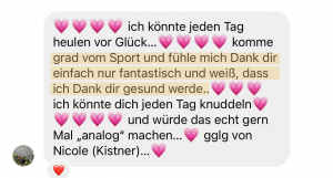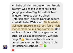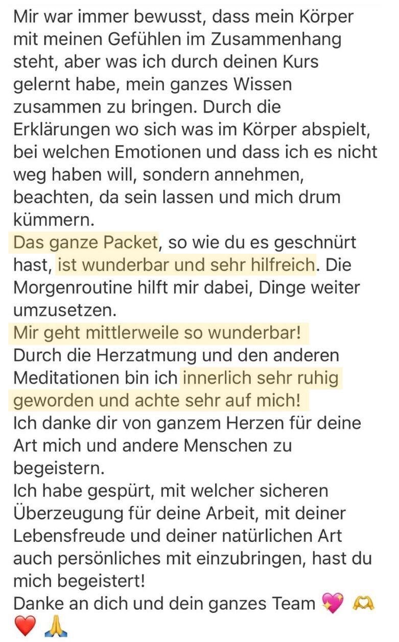 Der Kurs ist einfach genial und jeder sollte diesen unbedingt machen, um sich und seinen Körper noch besser zu verstehen. Mir sind sooo viele Zusammenhänge dadurch einfach noch klarer und bewusster geworden. Liebe Korinna, ich möchte dir einfach nur DANKE sagen !!! Es war super schön, wieder einmal einen kleinen Teil meines Weges mit dir zusammen zu gehen!!! Ich liebe deine Energie! Du hast gesagt: "In diesem Kurs steckt so viel Liebe drin". Das kann ich nur bestätigen. Ich konnte fühlen, wieviel Liebe du in deine täglichen Videos und in die Q and A gesteckt hast.