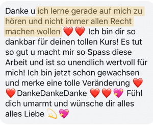 Ich möchte Korinna wirklich noch Mal aus tiefstem Herzen für diesen wundervollen Kurs danken! Sie steckt so viel Liebe hinein und vermittelt so ein umfangreiches Wissen, erklärt alles so toll an vielen Beispielen und hat einfach so eine liebevolle, einfühlsame Art und ich könnte ihr einfach stundenlang zuhören. Ich bin einfach nur dankbar sie gefunden zu haben, weil sie mein Leben so sehr bereichert hat! All das, was es in diesem Kurs zu entdecken, zu verstehen und anzuwenden gibt – macht dieses Kurs einfach einmalig. Dazu kommen noch so viele Bonis – einfach toll, was Korinna sich da einfallen lassen hat! Ich glaube tatsächlich, dass dieser Kurs jeden Euro wert ist – sogar noch mehr!