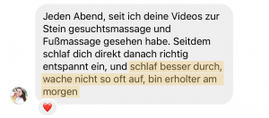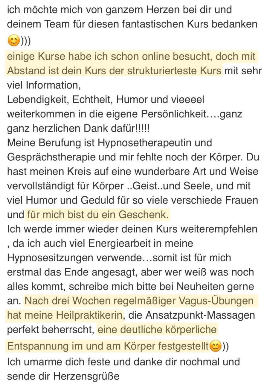 Der Kurs war sooo umfangreich und hat mir so tiefes Wissen über mich und meinen Körper vermittelt. Du hast so viele Fragen von uns allen beantwortet, einfach Wahnsinn, dadurch hatte ich noch zusätzlich so viele Klick-Momente. Dein Video von der Fussmassage ist fantastisch, genau wie all die anderen Zusatzvideos.