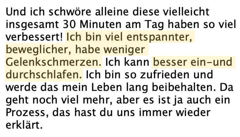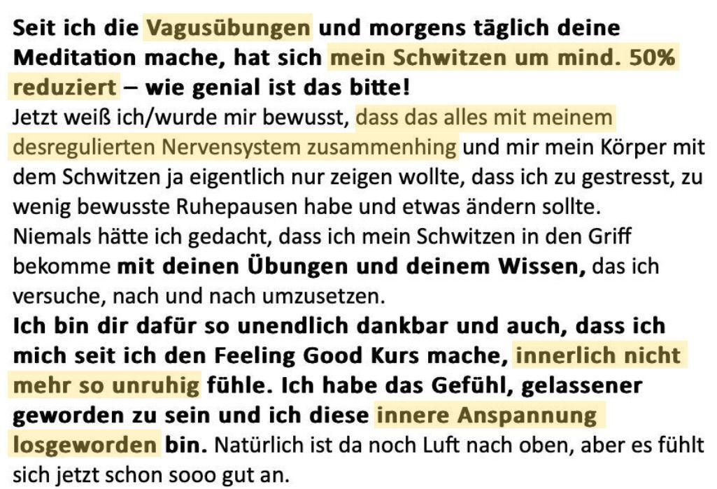 Ich würde sagen mein Leben hat sich so sehr zum Positiven verändert bzw. es ist noch mitten dabei und tut es auch noch weiter durch die vielen Erkenntnisse, die ich gewinnen konnte. Ich bin schon so viel entspannter geworden, was sich auch direkt bei meinem Blutdruck bemerkbar gemacht hat (ich brauche keine Tabletten, um ihn runter zu "drücken"), stattdessen versuche ich mich in Stresssituationen mit den tollen Vagusübungen, welche Korinna uns gezeigt hat, runterzubringen und mich durch ihre Meditationen zu entspannen. Diese habe ich auch fest in meiner Morgenroutine integriert, sowie auch das warme Wasser und meinem Bauch ging es ewig nicht mehr so lange so gut! Ein weiterer Punkt ist, dass ich anderen Menschen gegenüber viel offener geworden bin und diese mehr an mich ran lasse und ich kann meine Gefühle wieder besser wahrnehmen.