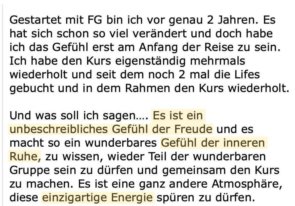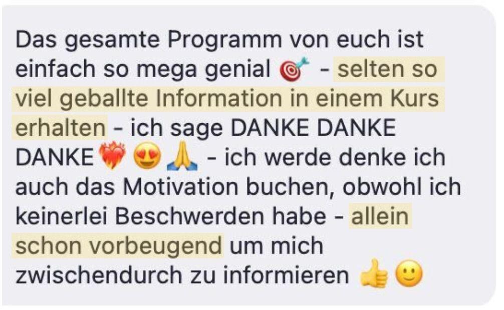 Da steckt so viel drin, dass ich finde, jeder sollte diesen Kurs besuchen. Dieser Kurs ist ein Geschenk. DU BIST EIN GESCHENK. Ich bin so begeistert von deinem Wissen und wie du es vermittelst. Ich hatte einfach so viele AHA-Momente, das kann ich hier gar nicht alles aufzählen. Mir sind immer wieder Freunde/Familie eingefallen, denen ich direkt von entsprechenden Erkenntnissen erzählt habe, weil es auch ihnen helfen könnte. Der Kurs ist unbezahlbar; du gibst so viel mehr, auch die ganzen Zusatzangebote.