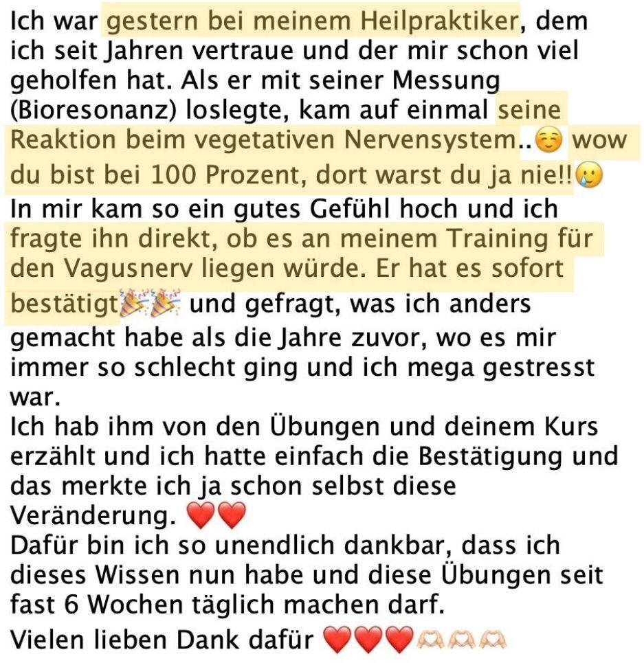 Ich habe verstanden, was der Vagusnerv für eine große Rolle in meinem Leben spielt. Er ist mein persönlicher Gamechanger für Entspannung und Leichtigkeit. Viele Puzzleteile, die mir bereits bekannt waren, fügen sich so noch besser zu einem großen Ganzen zusammen und geben mir die nötige Ruhe in meinem Alltag. Mir ist noch einmal bewusster geworden, wie sehr ich meinem Körper vertrauen kann und zuhören darf. Das ein oder andere, was ich schon gehört hatte, ist mir durch den Kurs wieder bewusst geworden und damit zurück an die Oberfläche gekommen.